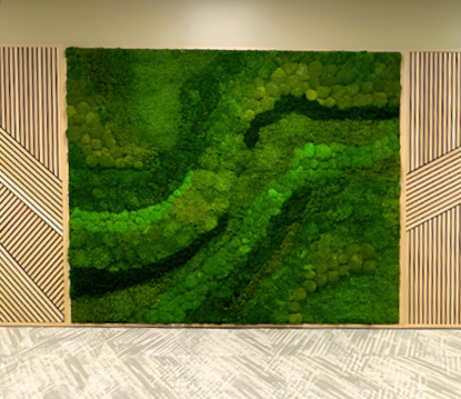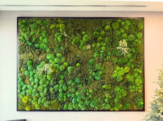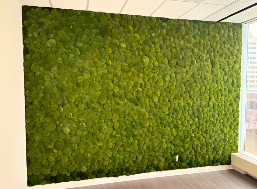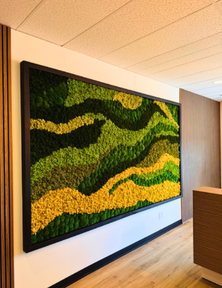Moss walls are artwork made from real moss, branches, and plants, preserved in an eco-friendly way using 100% natural oils and food dye. They require no light, no water, and no maintenance. As long as the humidity of the space is above 30%, they will keep looking fresh for a long time. This makes moss walls perfect for any hard to reach or low light space, such as: